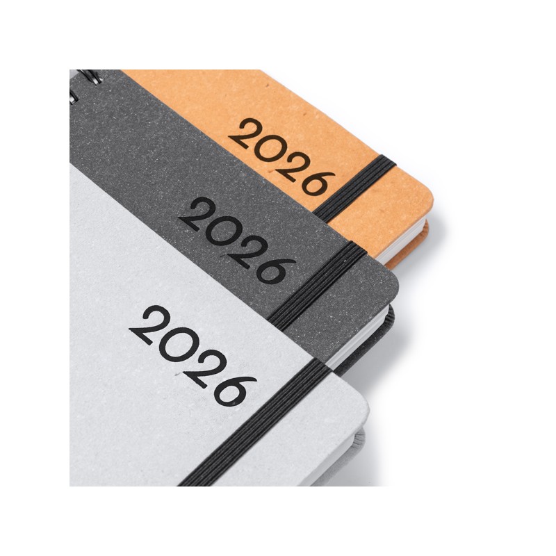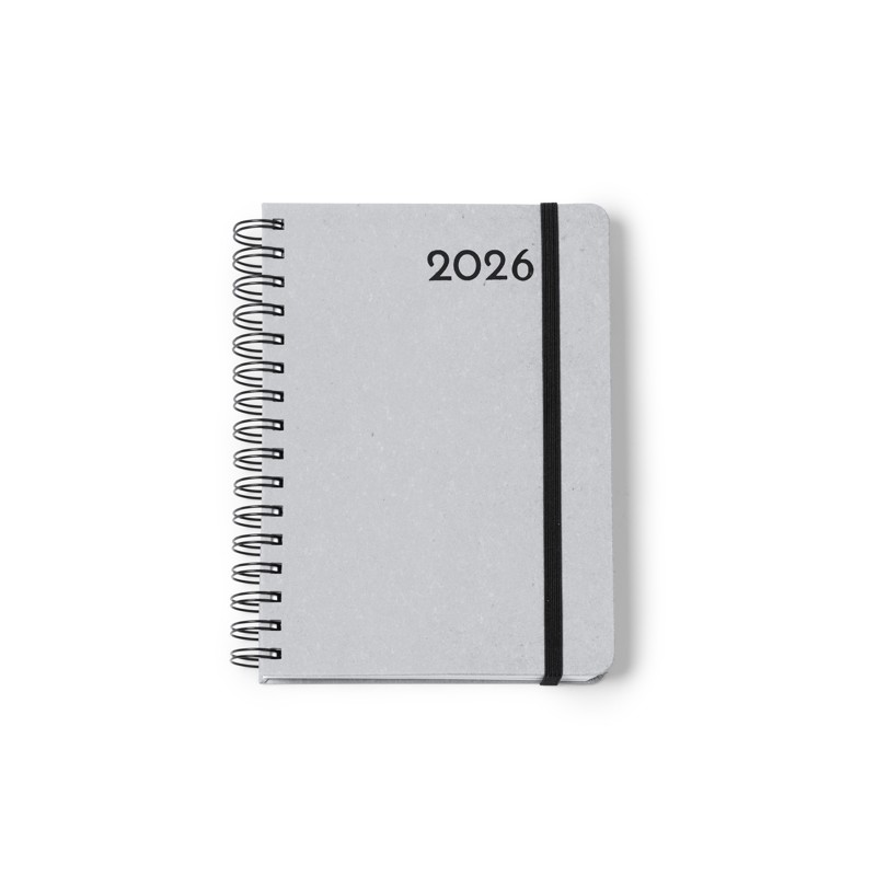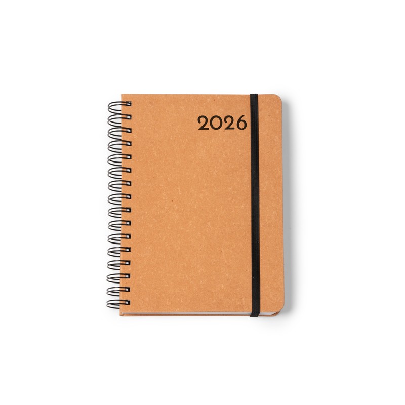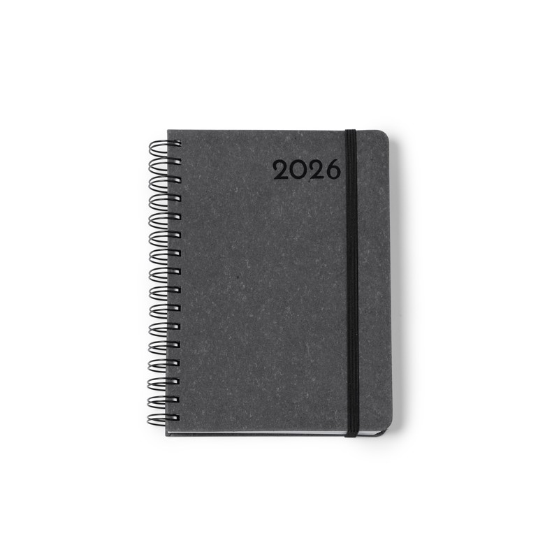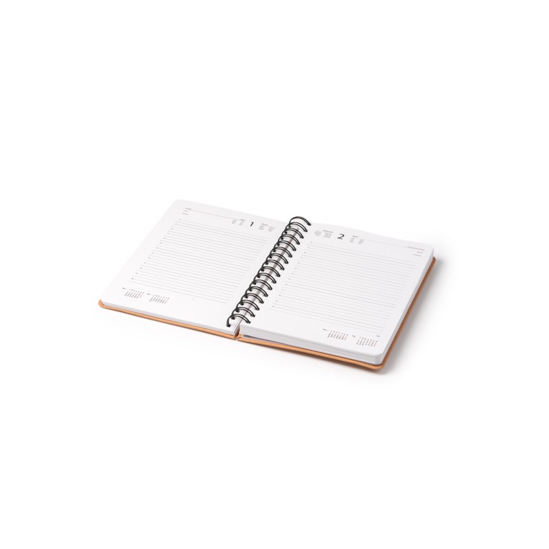 Agenda con anillas tamaño A5, con tapas de cuero reciclado grabadas en bajo relieve y banda elástica. Cuenta con 348 páginas de papel blanco y 4 páginas adicionales con mapas. Ideal para mantener tus notas organizadas con estilo y durabilidad.