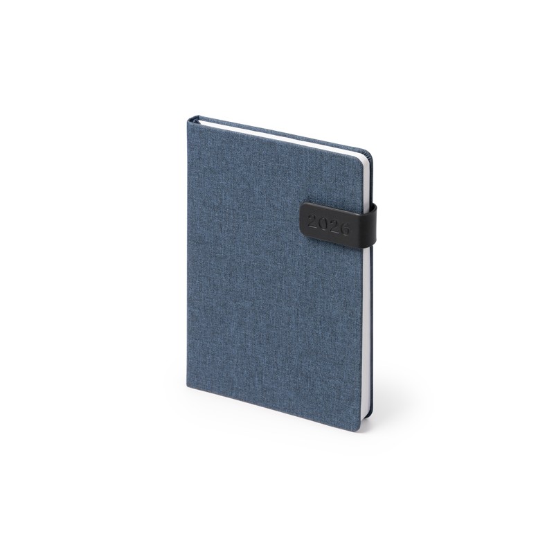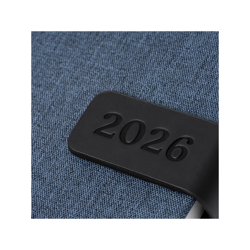 Agenda tamaño A5 realizada con poliéster reciclado RPET con cubierta magnética. 320 páginas más 4 páginas con mapas. Marcador de páginas en color a juego con la portada. Impresión a color 2+2. Papel interior de color blanco.