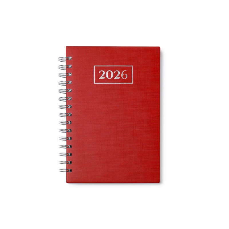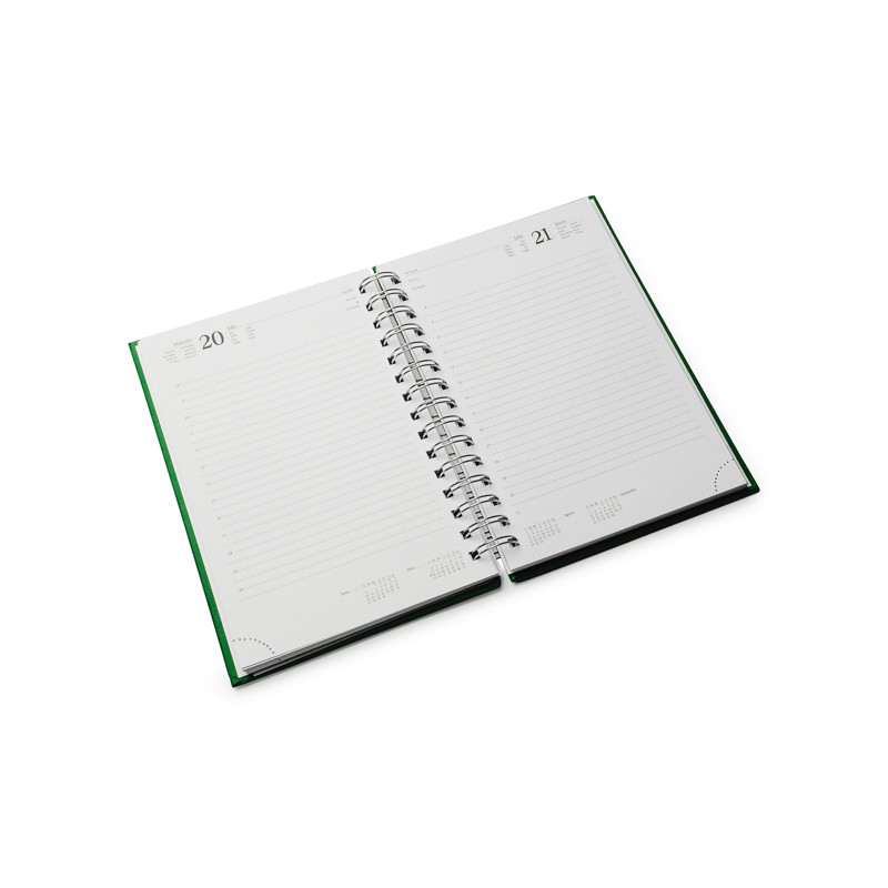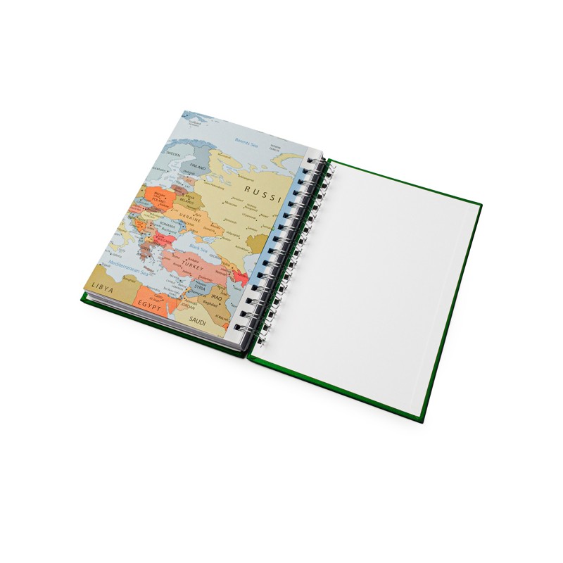 Agenda con anillas tamaño A5. Tapas de PU acolchadas con grabado bajo relieve. 348 páginas más 4 páginas con mapas. Gramaje del papel 60gsm.