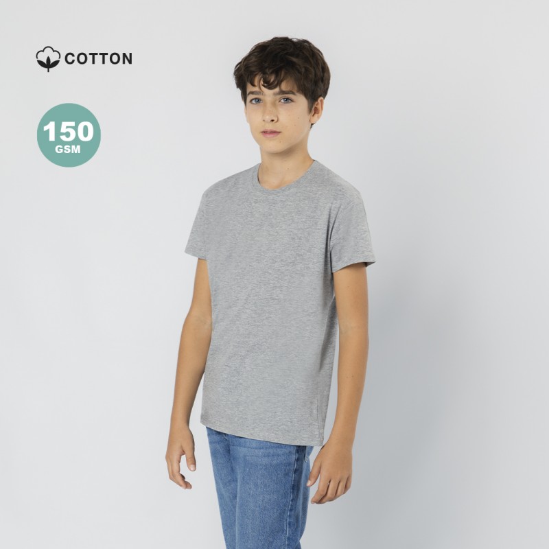 Camiseta infantil unisex de manga corta, confeccionada en suave 100% algodón punto liso 150 g/m2. Con costuras laterales. Cuello redondo en canalé 1x1 y cubrecosturas a tono.