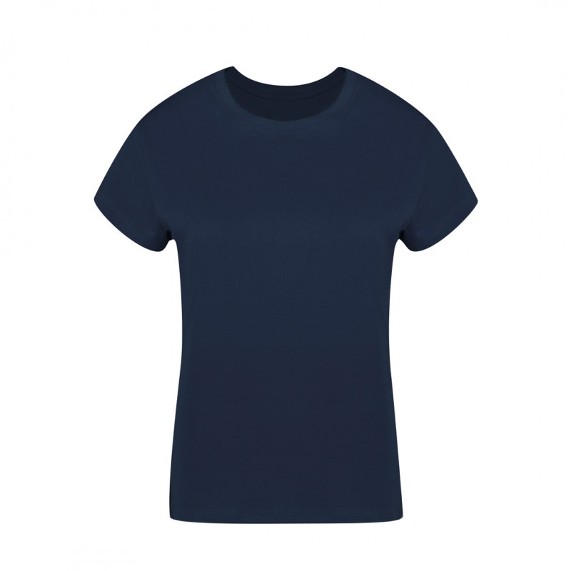 Camiseta de mujer. Confeccionada en punto liso con 100% algodón y estilo Single Jersey de 160g/m2. Tacto suave y corte moderno, con cosido lateral. Cuello redondo estrecho en canalé 1x1. Doble costura en dobladillo y mangas, para una mayor durabilidad y resistencia al uso intensivo. Etiqueta fácilmente removible.